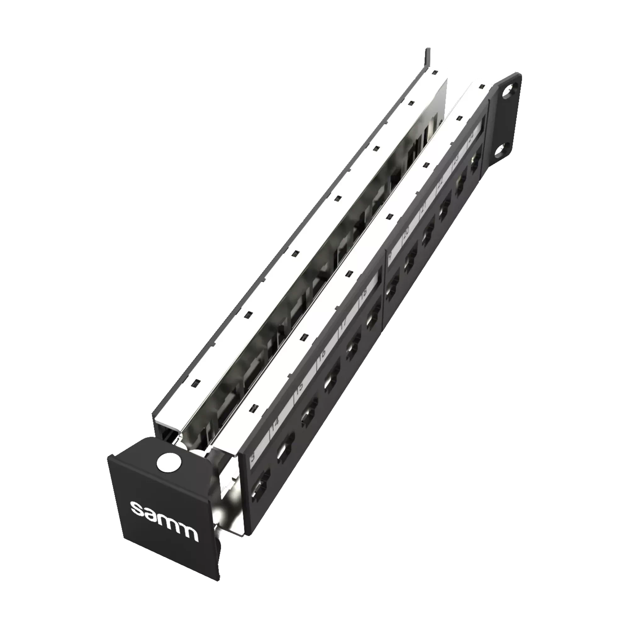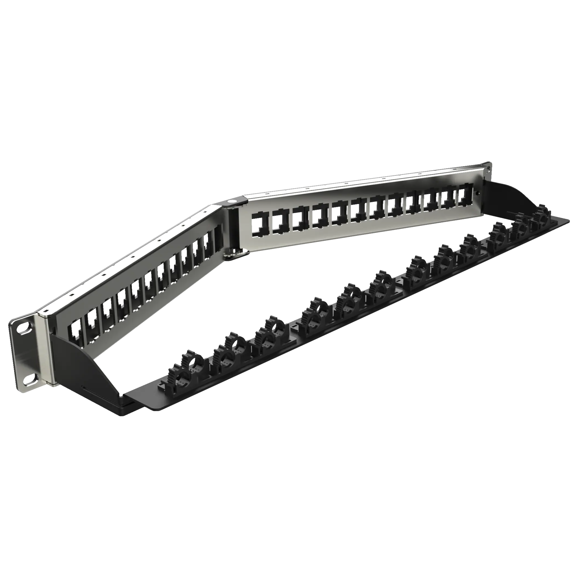 FeaturesThe PANEL-1.0U-SHLD-UNL-ANG-24P with SCM is a professional 1U shielded, unloaded, angled patch panel designed for structured cabling systems. It fits standard 19-inch racks and supports 24 Cat.5e, Cat.6, or Cat.6A keystone jacks. The angled (ANG) front design improves cable routing toward side cable managers, helping reduce front congestion and maintain proper bend radius. Its shielded metal construction minimizes electromagnetic interference, while the integrated SCM (Surface Cable Manager) at the rear ensures organized cable routing and strain relief. This patch panel is ideal for enterprise networks, data centers, and commercial installations.